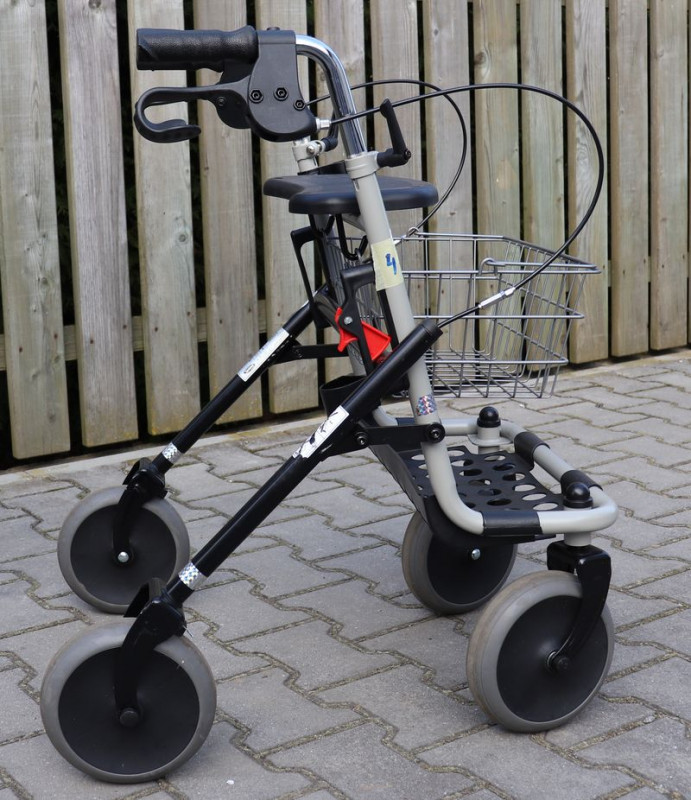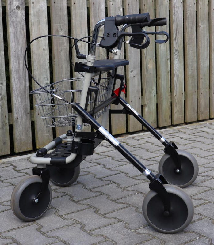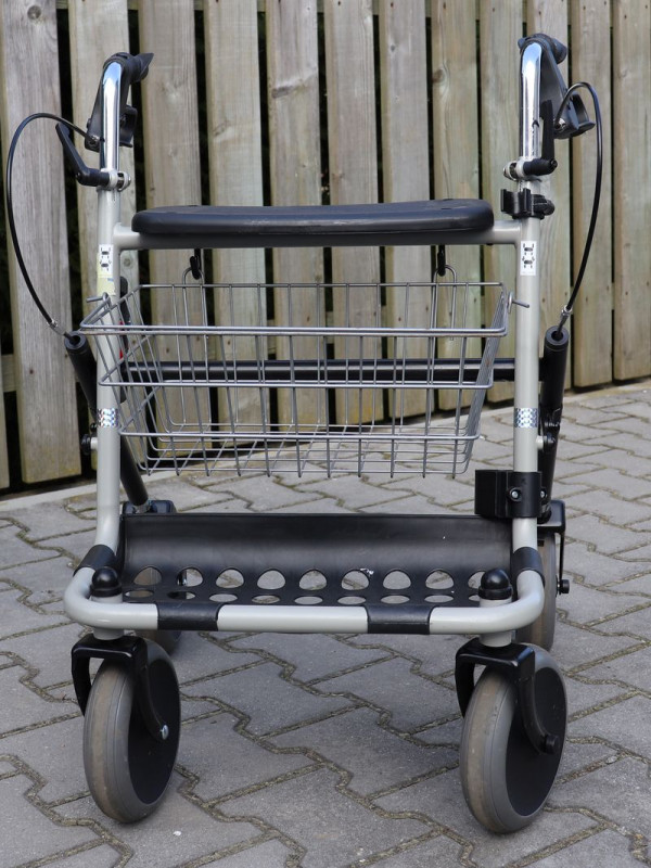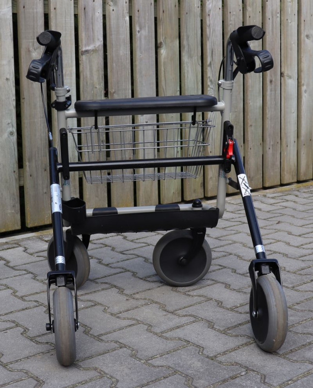 Chodítko pro seniory, vhodné na venkovní i domácí použití, nastavitelná madla, brzdy, košík, držák na hole.Chodítko je skládací.