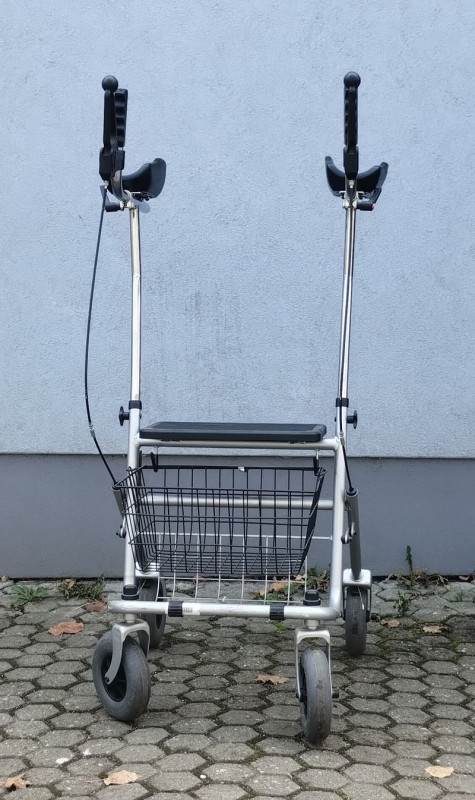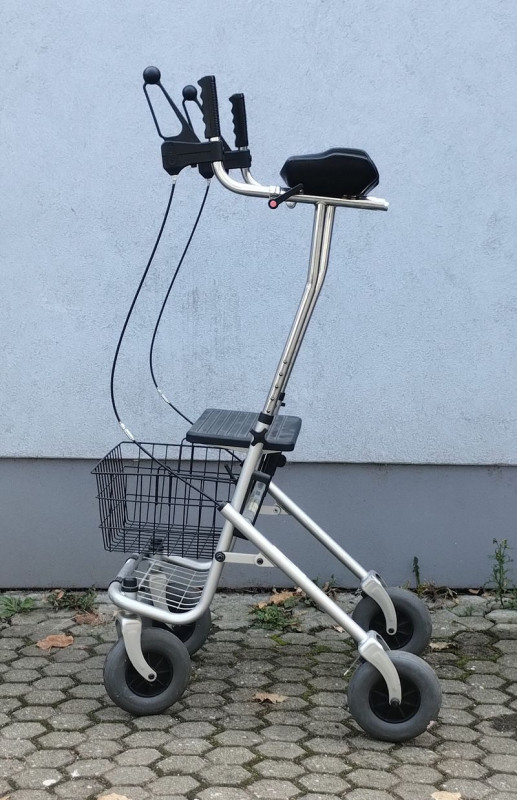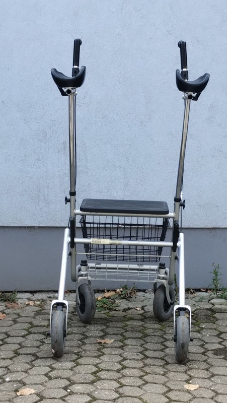 Skládací rám, plynule nastavitelná výška madel,madla hloubkově a úhlově nastavitelná.Přítlačné brzdy s možností aretace, sedátko, a košík.