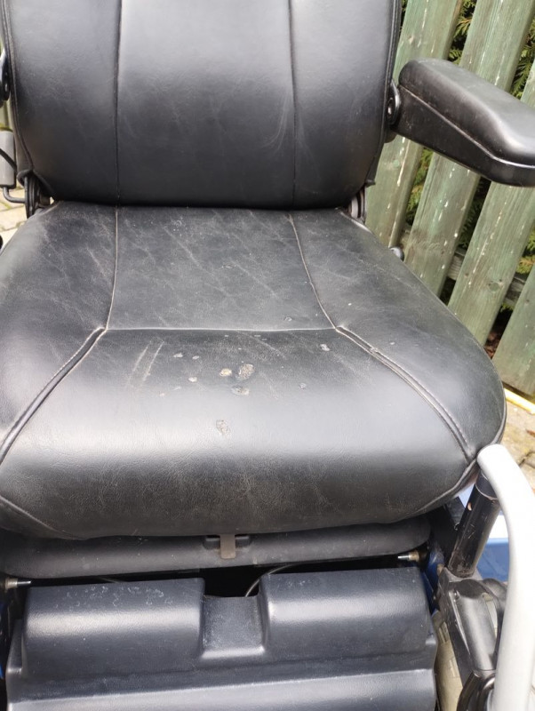 vozík má odřené plasty, propálenou sedačku od cigaret,