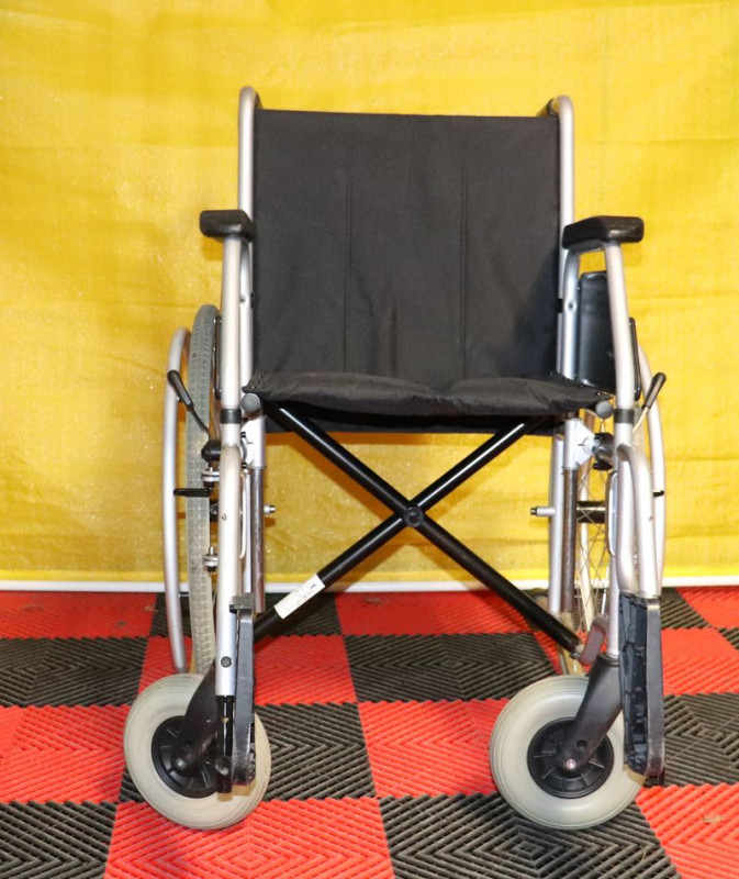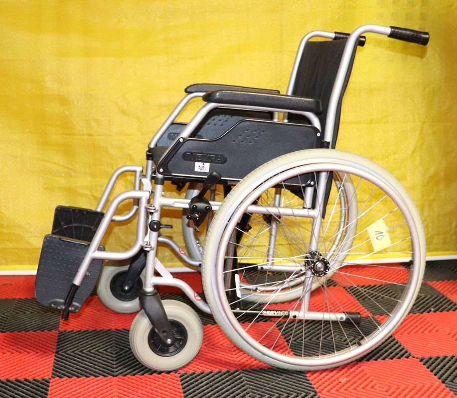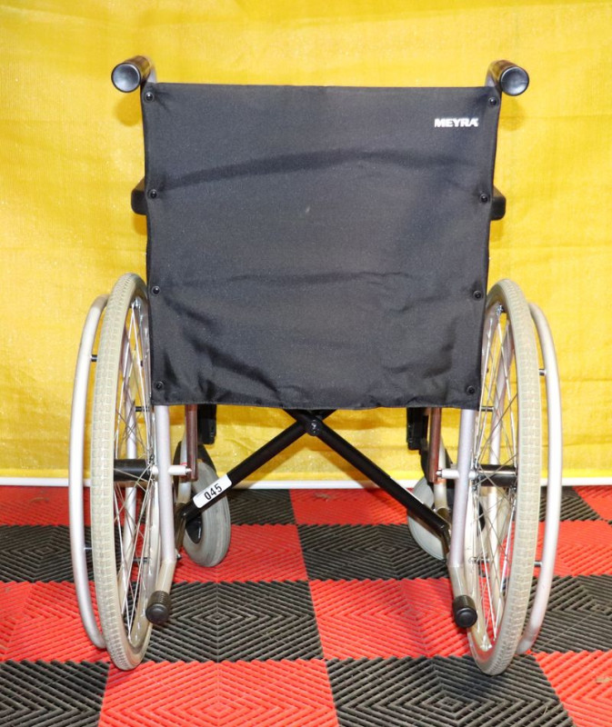 Mechanický invalidní vozík Meyra.Šíře sedu 45 cm.Hloubka sedu 43 cm.Výše zad 41 cm.Celková šíře 67 cm.Přední i zadní kola plná.