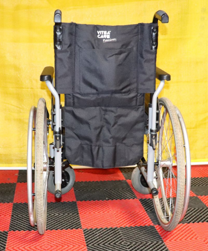 Mechanický invalidní vozík Vitea-Care.Šíře sedu 42 cm.Hloubka sedu 42 cm.Výše zad 45 cm.Celková šíře 65 cm.Přední i zadní kola plná.