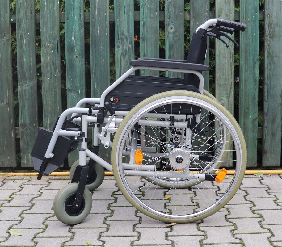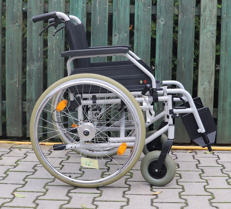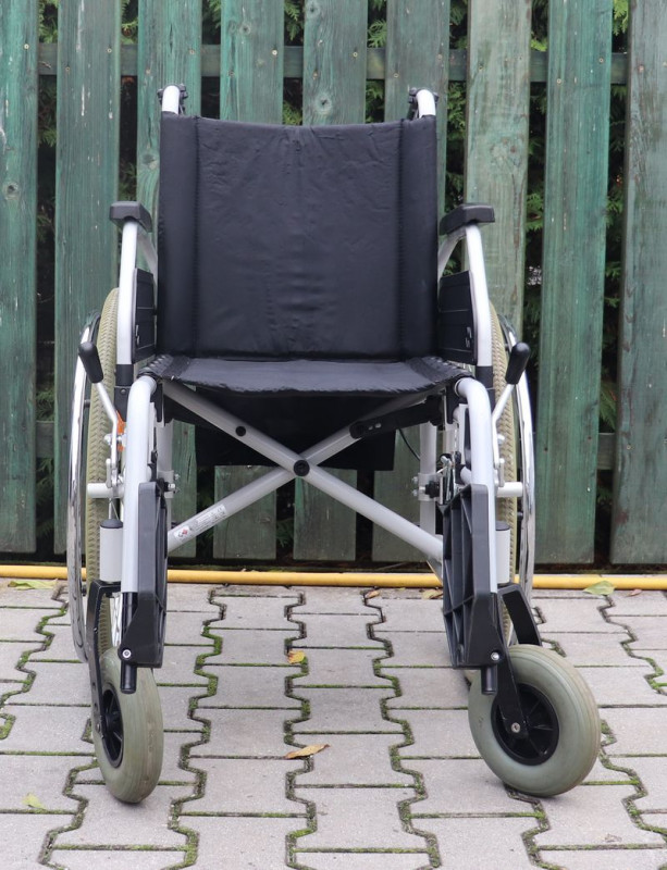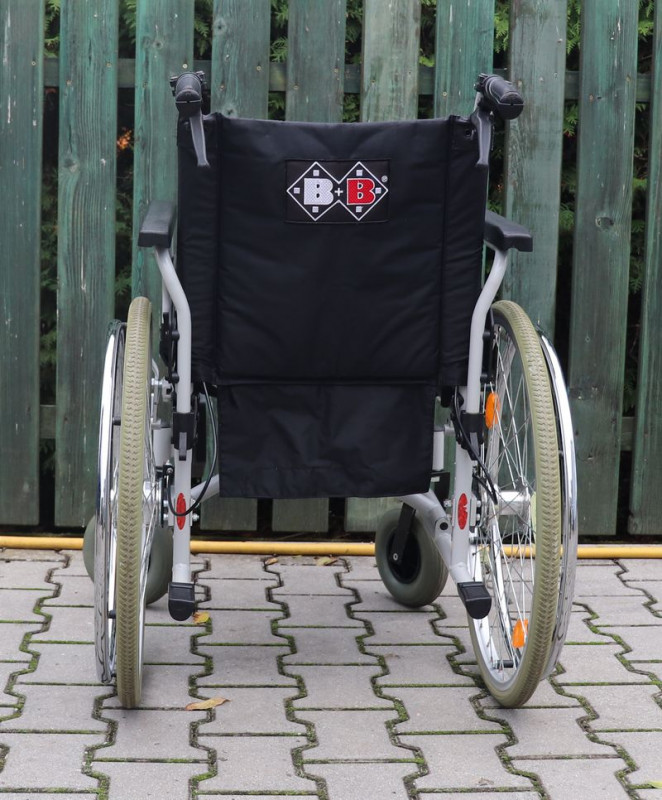 Mechanický invalidní vozík B+B.Šíře sedu 43 cm.Hloubka sedu 43 cm.Výše zad 40 cm.Celková šíře 63 cm.Přední i zadní kola plná.