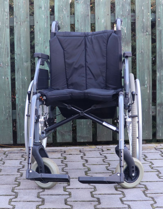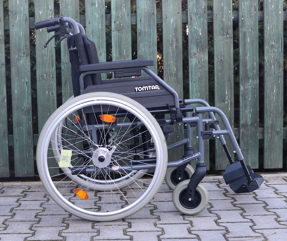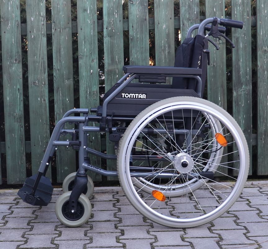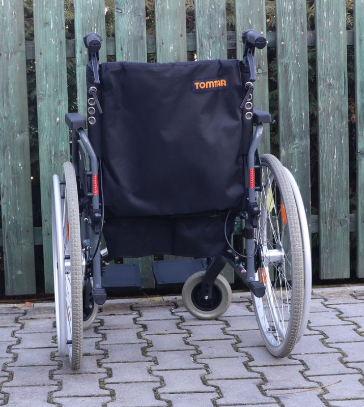 Mechanický invalidní vozík Tomtar.Šíře sedu 48 cm.Hloubka sedu 40 cm.Výše zad 42 cm.Celková šíře 68 cm.Přední i zadní kola plná.Rychloupínáky.