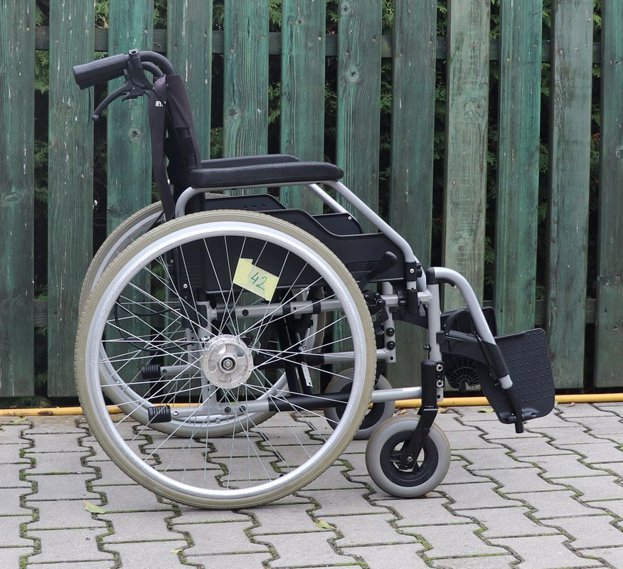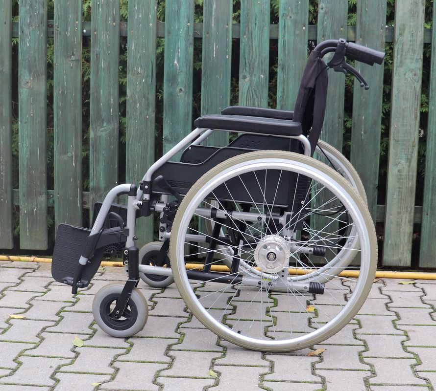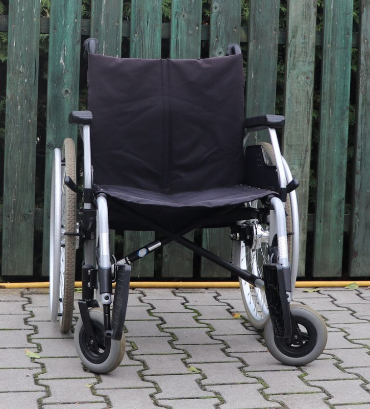 Mechanický invalidní vozík Meyra.Šíře sedu 51 cm.Hloubka sedu 44 cm.Výše zad 44 cm.Celková šíře 72 cm.Přední i zadní kola plná.