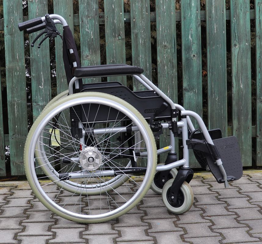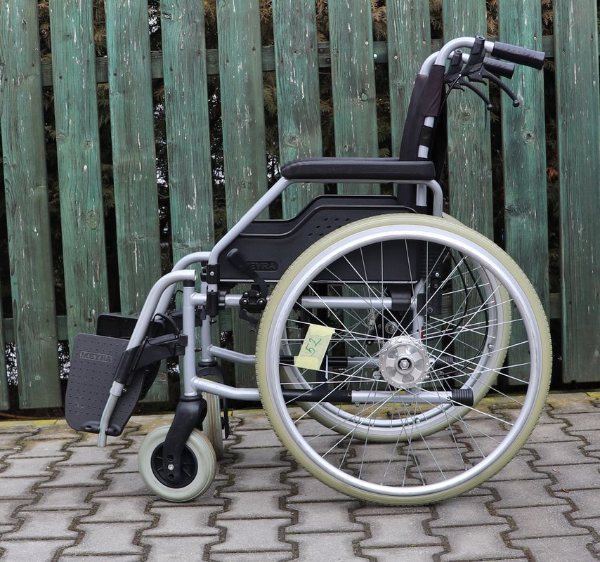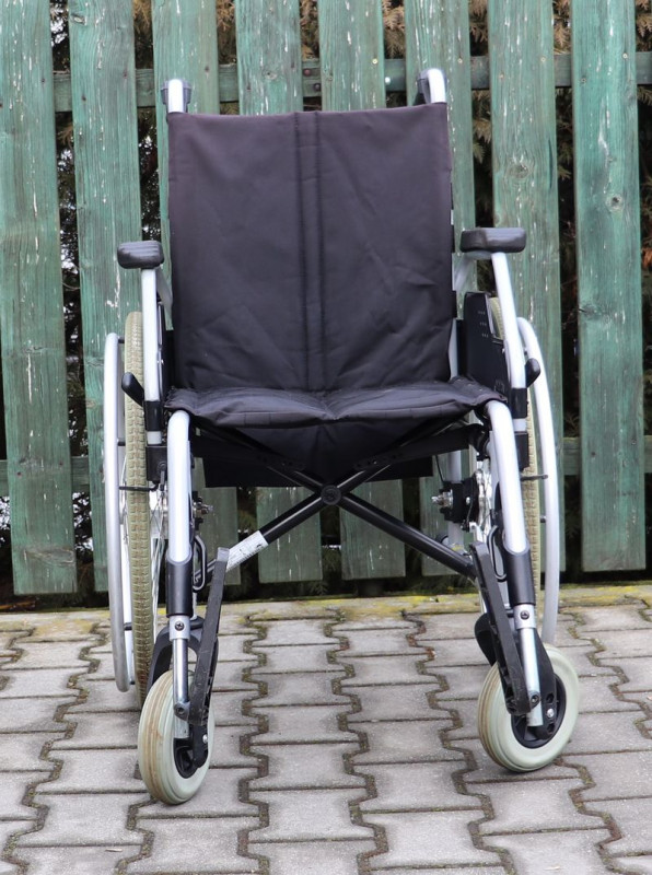 Mechanický invalidní vozík Meyra.Šíře sedu 44 cm.Hloubka sedu 44 cm.Výše zad 44 cm.Celková šíře 64 cm.Přední i zadní kola plná.Brzdy pro doprovod.
