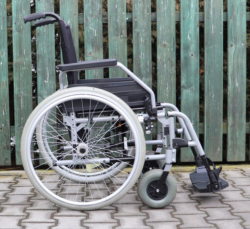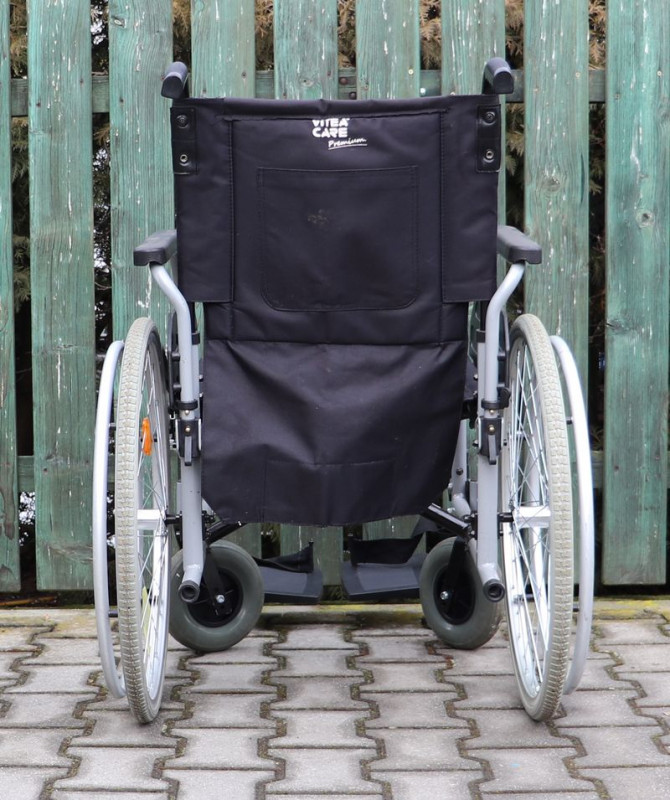 Mechanický invalidní vozík Vitea-Care.Šíře sedu 44 cm.Hloubka sedu 41 cm.Výše zad 45 cm.Celková šíře 67 cm.Přední i zadní kola plná.