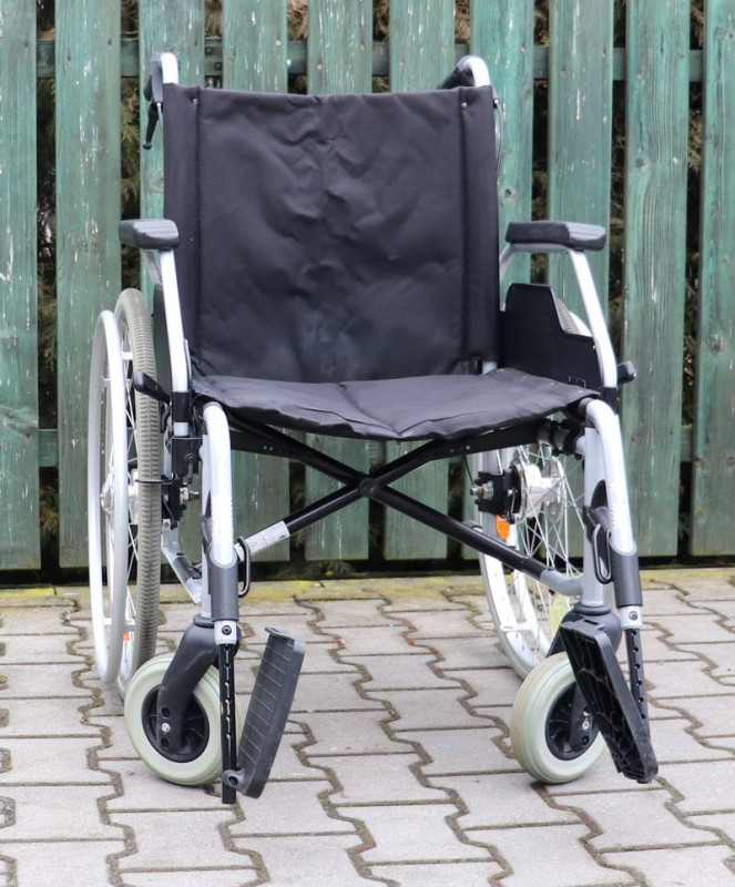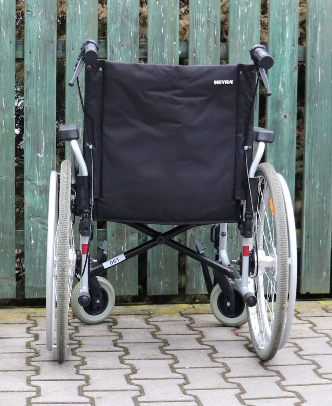 Mechanický invalidní vozík Meyra.Šíře sedu 52 cm.Hloubka sedu 44 cm.Výše zad 45 cm.Celková šíře 72 cm.Přední i zadní kola plná.