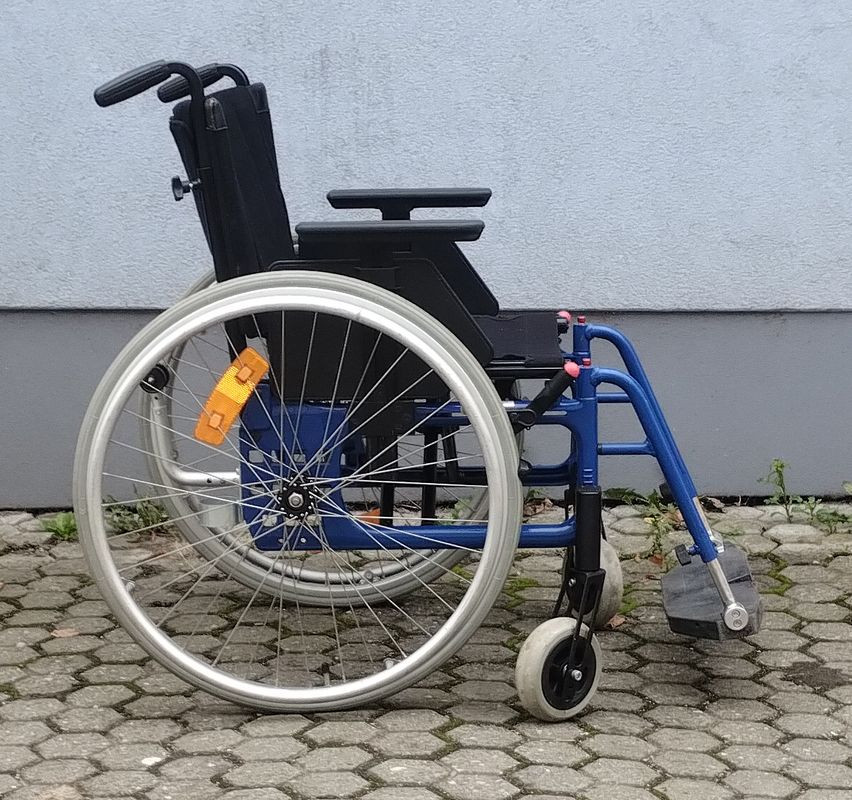 Mechanický invalidní vozík Meyra.Šíře sedu 43 cm.Hloubka sedu 400 cm.Výše zad 39 cm.Celková šíře 63 cm.Přední kola plná.