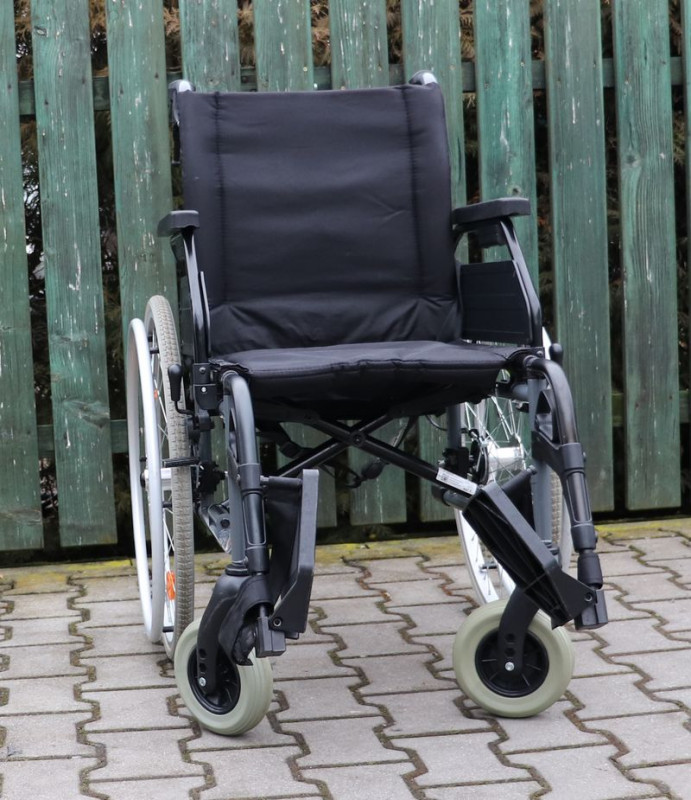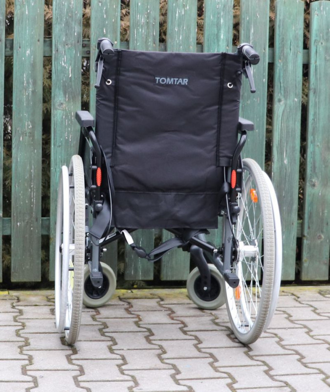 Mechanický invalidní vozík Tomtar.Šíře sedu 45 cm.Hloubka sedu 43 cm.Výše zad 45 cm.Celková šíře 66 cm.Přední i zadní kola plná.