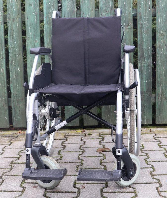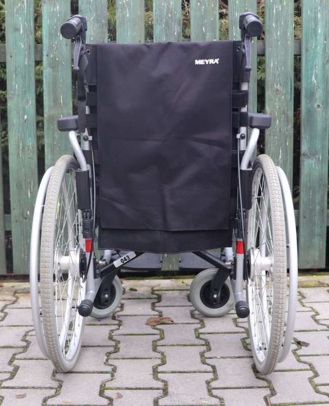 Mechanický invalidní vozík Meyra.Šíře sedu 45 cm.Hloubka sedu 42 cm.Výše zad 44 cm.Celková šíře 64 cm.Přední i zadní kola plná.Brzdy pro doprovod.