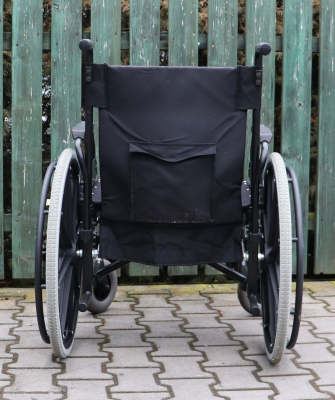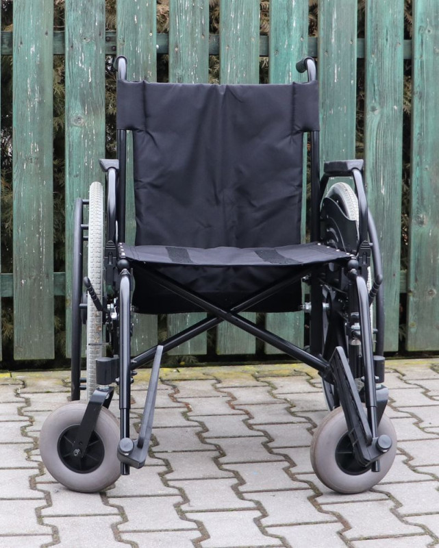 Mechanický invalidní vozík Sona.Šíře sedu 51 cm.Hloubka sedu 44 cm.Výše zad 42 cm.Celková šíře 73 cm.Přední i zadní kola plná.Rychloupínáky.