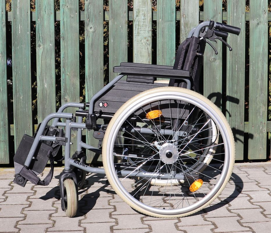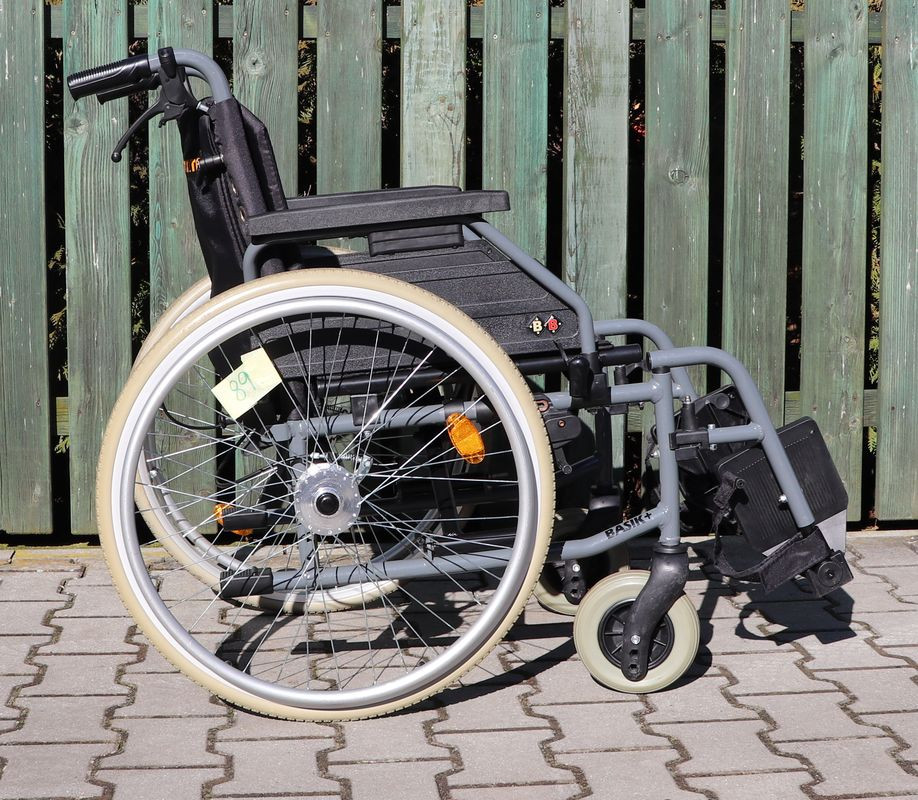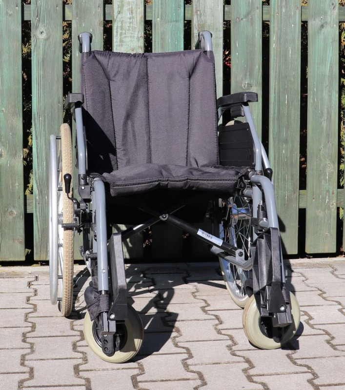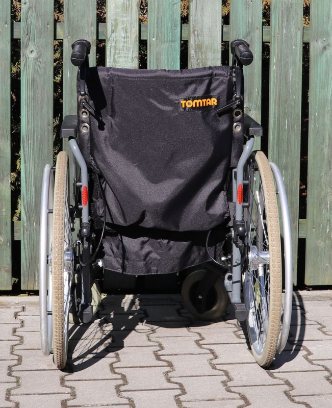 Mechanický invalidní vozík Tomtar.Šíře sedu 46 cm.Hloubka sedu 43 cm.Výše zad 43 cm.Celková šíře 63 cm.Přední i zadní kola plná.