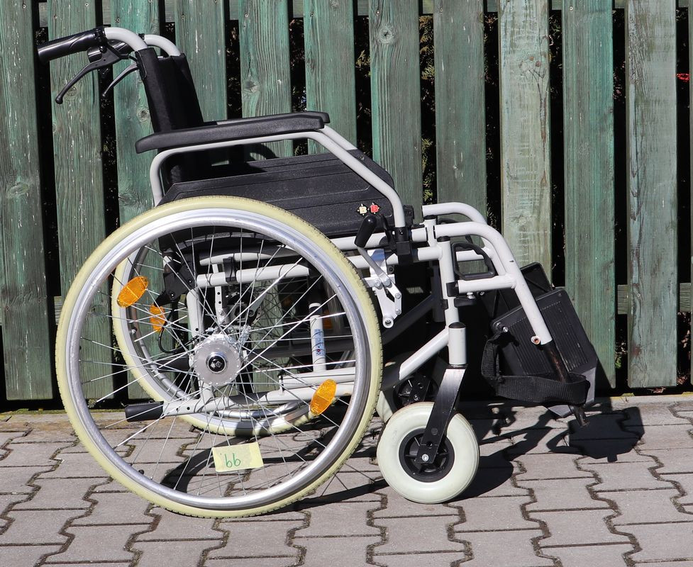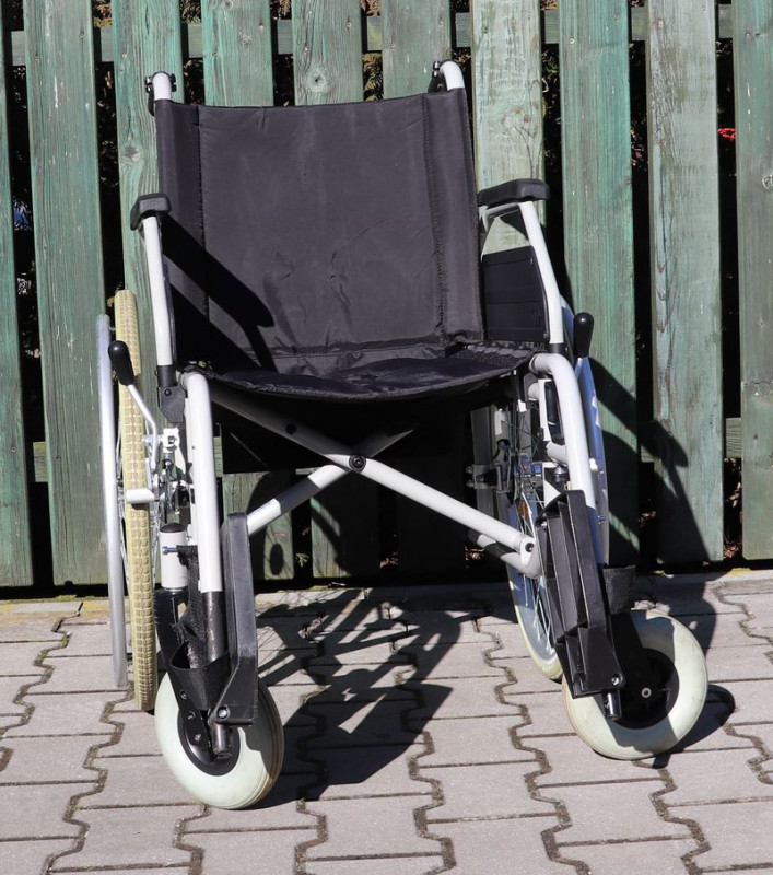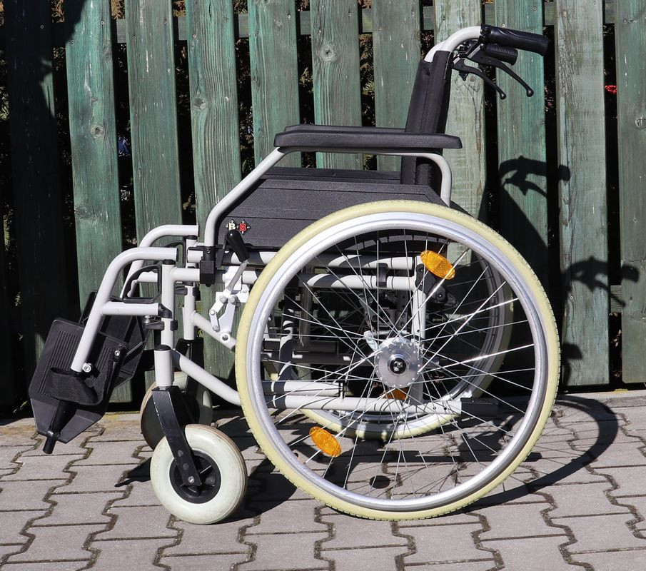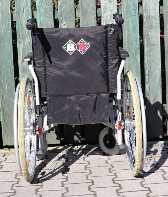 Mechanický invalidní vozík B+B.Šíře sedu 46 cm.Hloubka sedu 44 cm.Výše zad 41 cm.Celková šíře 67 cm.Přední i zadní kola plná.